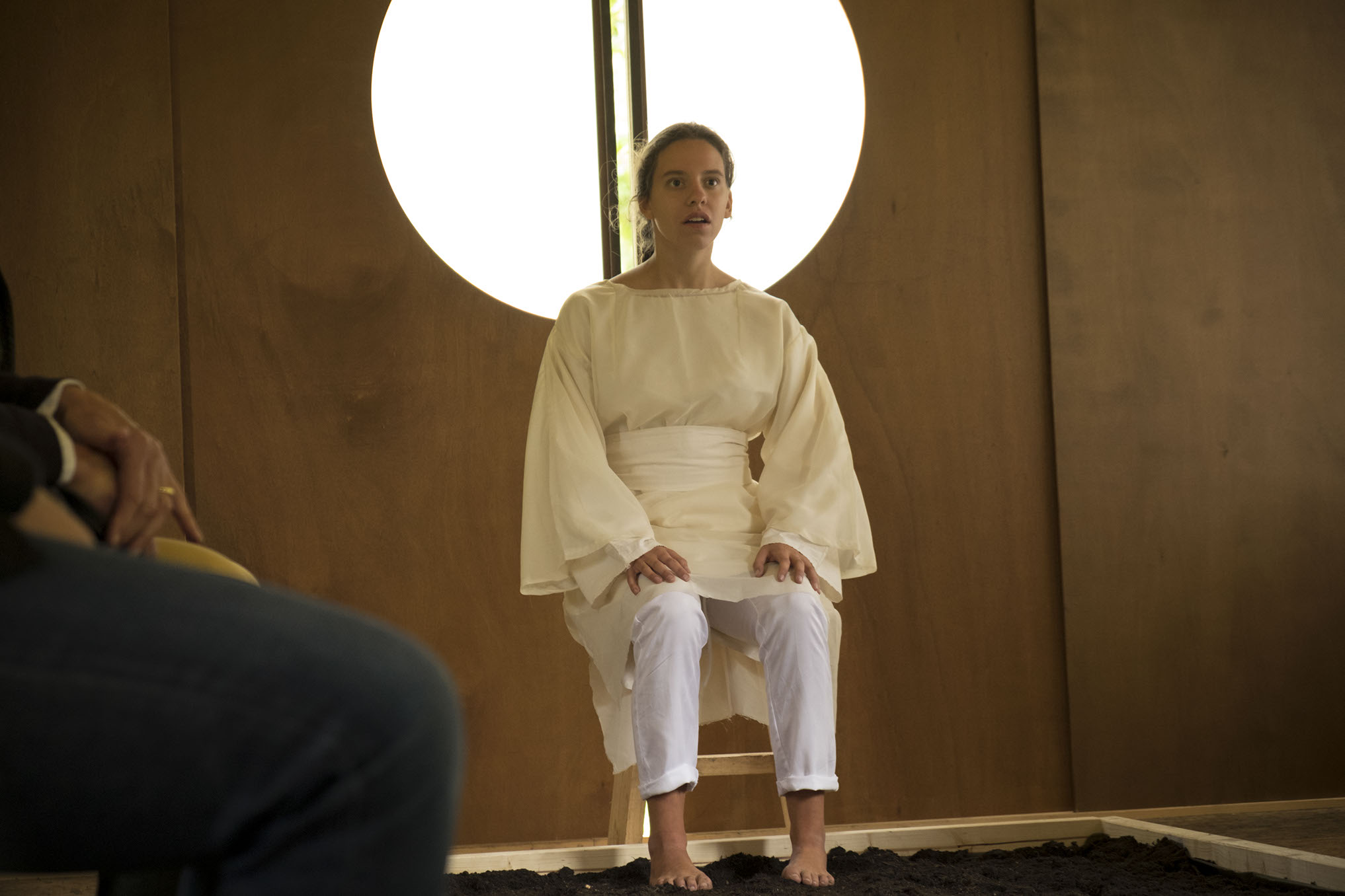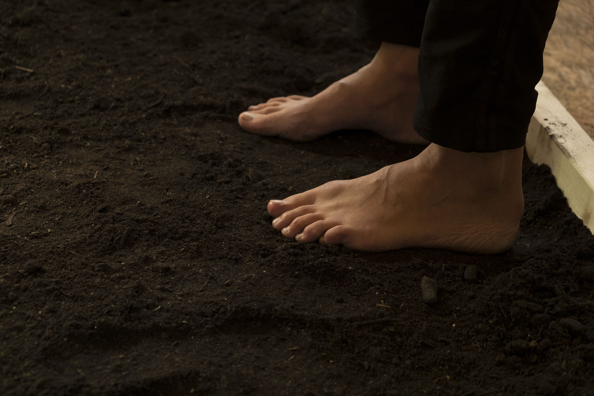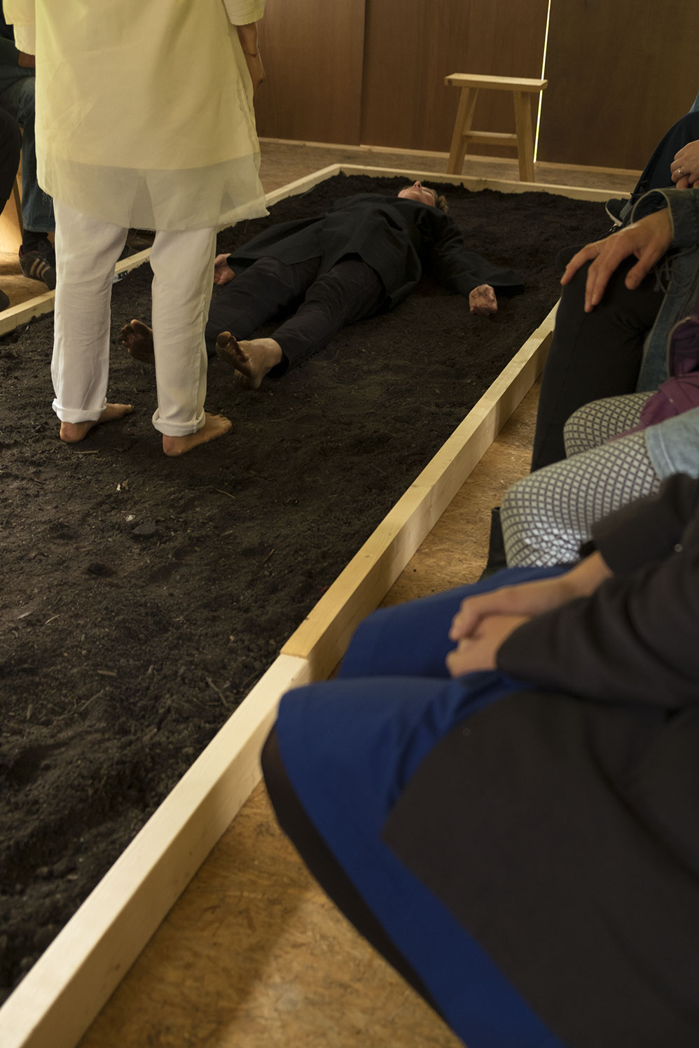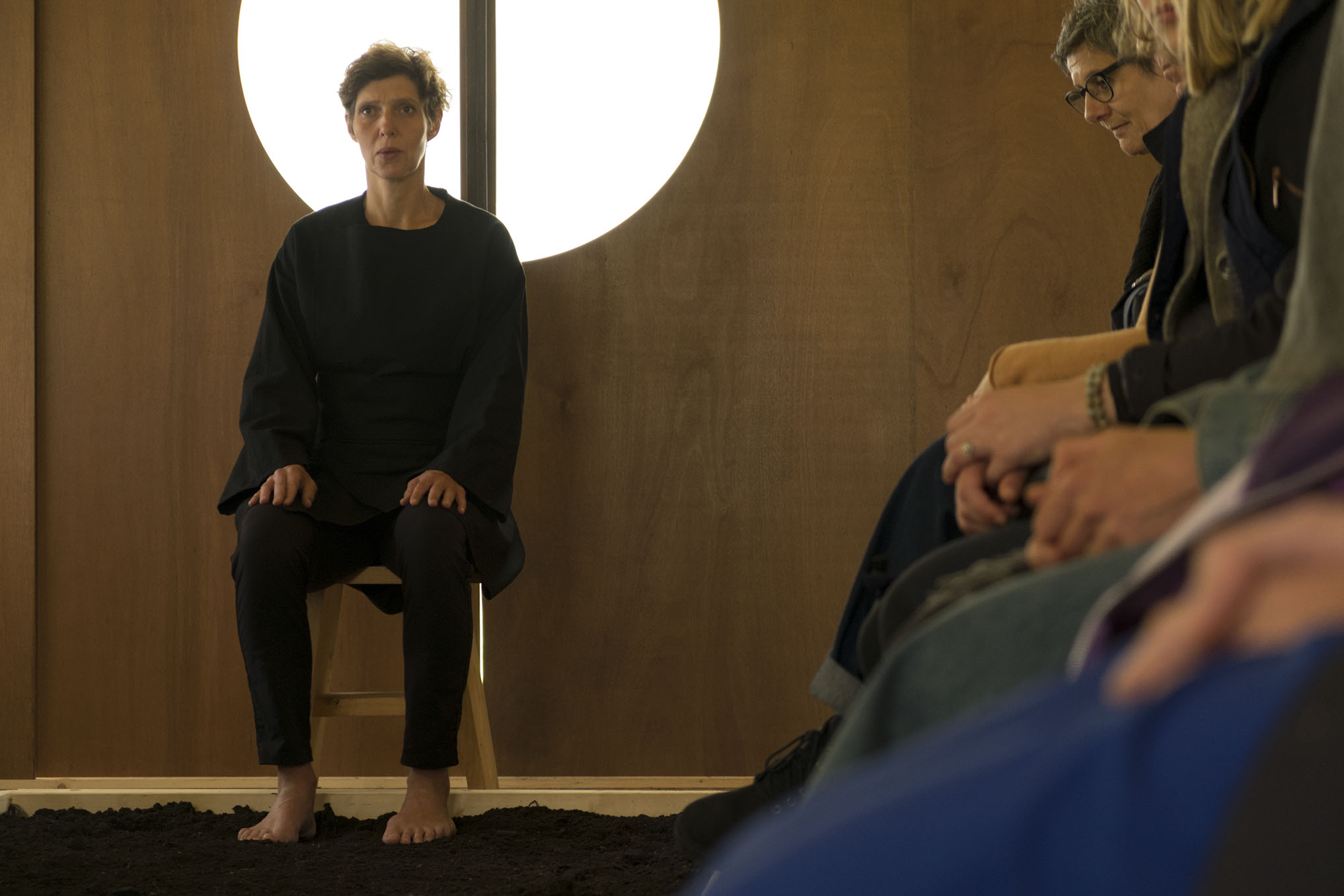 De ruimte is gesloten, alleen het raam staat open. Over 6 meter lengte van de ruimte ligt een berg zwarte aarde. Aan elke korte kant zit een vrouw, de ene vrouw begin twintig, de ander eind veertig. Langs de lengtezijde zitten de toeschouwers in twee rijen tegenover elkaar. Via de twee performers kijkt de toeschouwer naar de toeschouwer tegenover hem/haar en spiegelt hij/zij zich aan de ander. Deze performance speelt met de grens van aanwezigheid en afwezigheid. Waarin de berg aarde staat voor de dood, de afwezigheid en de blik naar de ander het leven is, de aanwezigheid.
