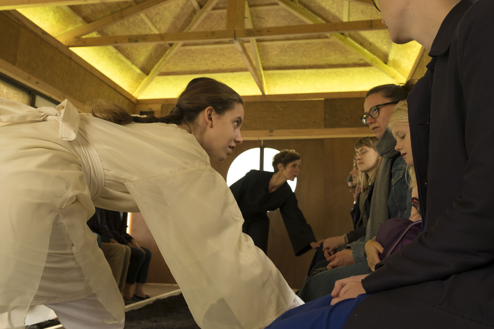 Voor deze performance is de adem het uitgangspunt. Zoë maakte haar inademing hoorbaar en Danielle haar uitademing. Het is een dialoog tussen dit ritme van ademen, waar langzaam bewegingen uit voort komt. Een intense performance met hoge concentratie, die onderbroken wordt met een direct kijken naar de toeschouwer. Halverwege de performance spreekt Danielle een tekst uit met vragen over aanwezigheid; het betekenis geven door te kijken en afwezigheid; ben ik er nog als ik straks wegga?
